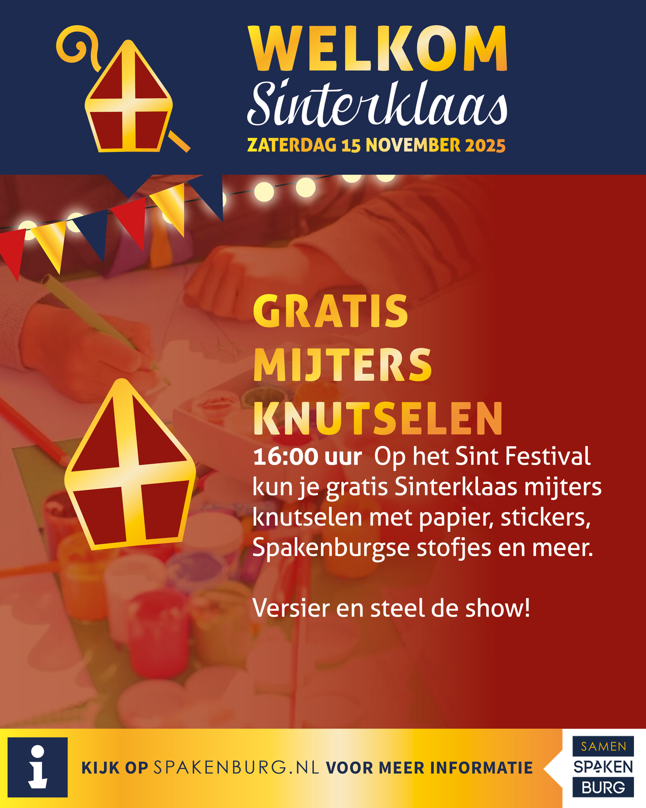 Ook dit jaar kun je weer gratis mijters knutselen op het Sint Festival onder leiding van lokale kunstenaars. Knip, kleur, scheur, verf en plak met o.a. Spakenburgse stofjes.