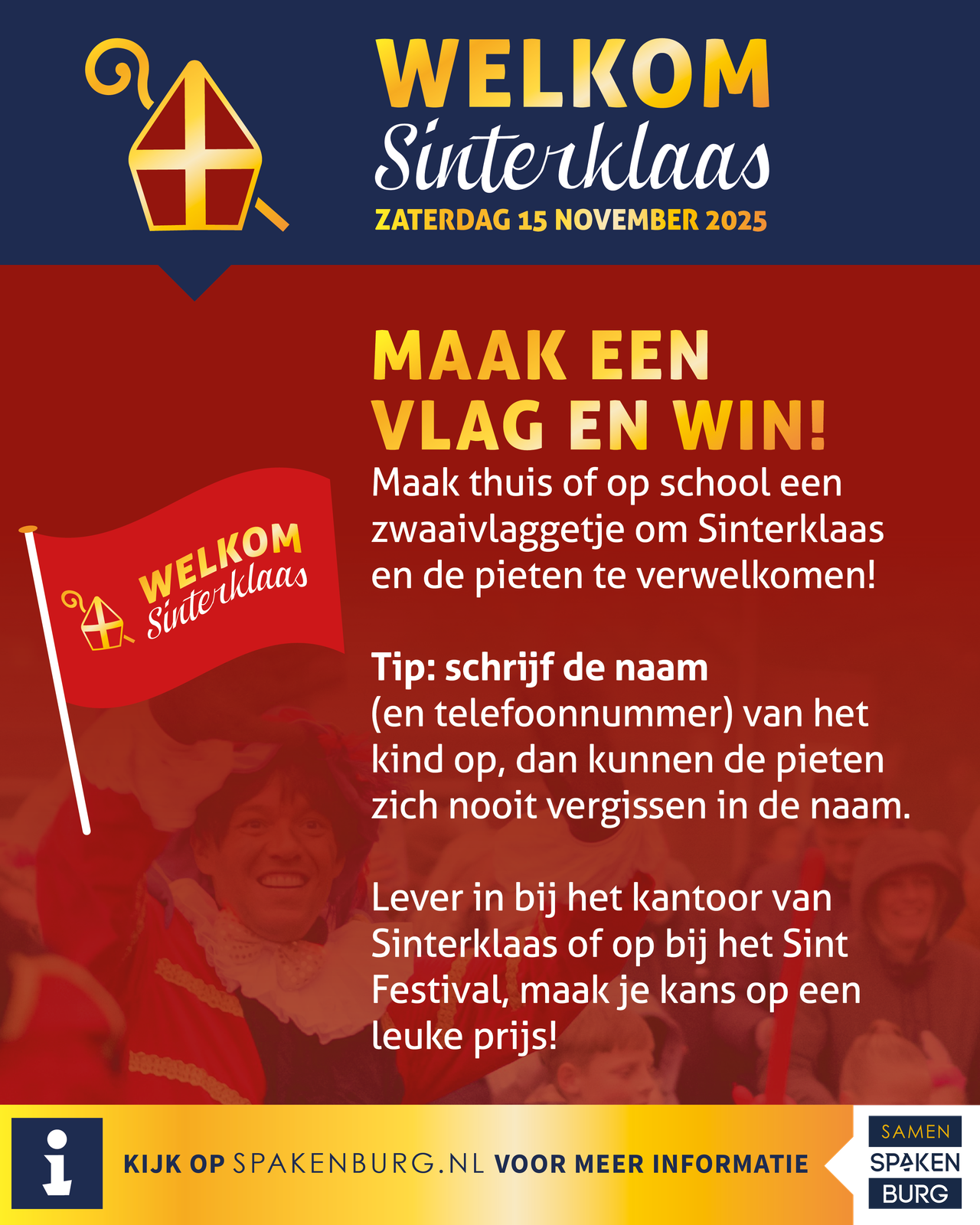 Maak thuis of op school een zwaaivlaggetje om Sinterklaas en de pieten te verwelkomen! Tip: schrijf de naam (en telefoonnummer) van het kind op, dan kunnen de pieten zich nooit vergissen in de naam. En..als je het vlaggetje inlevert bij het kantoor van Sinterklaas of op bij het Sintfestival, maak je kans op een leuke prijs!