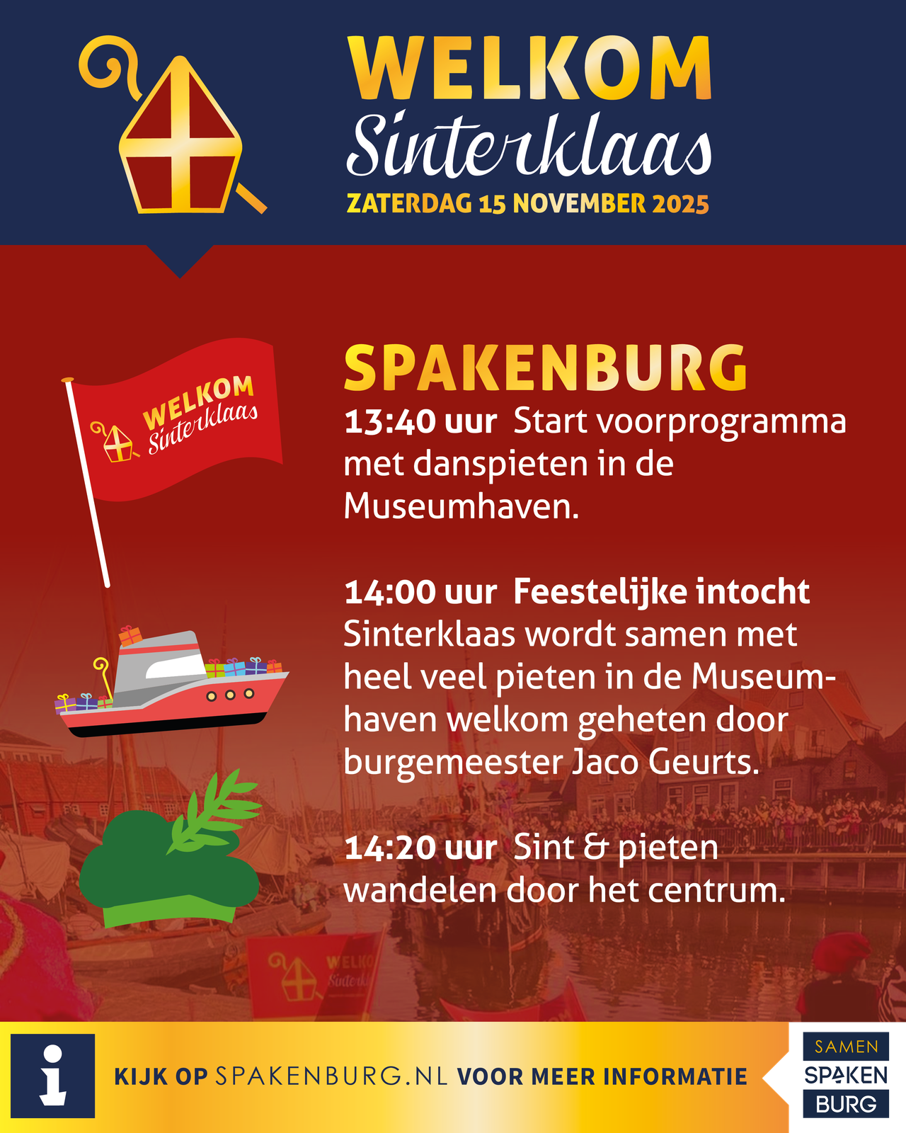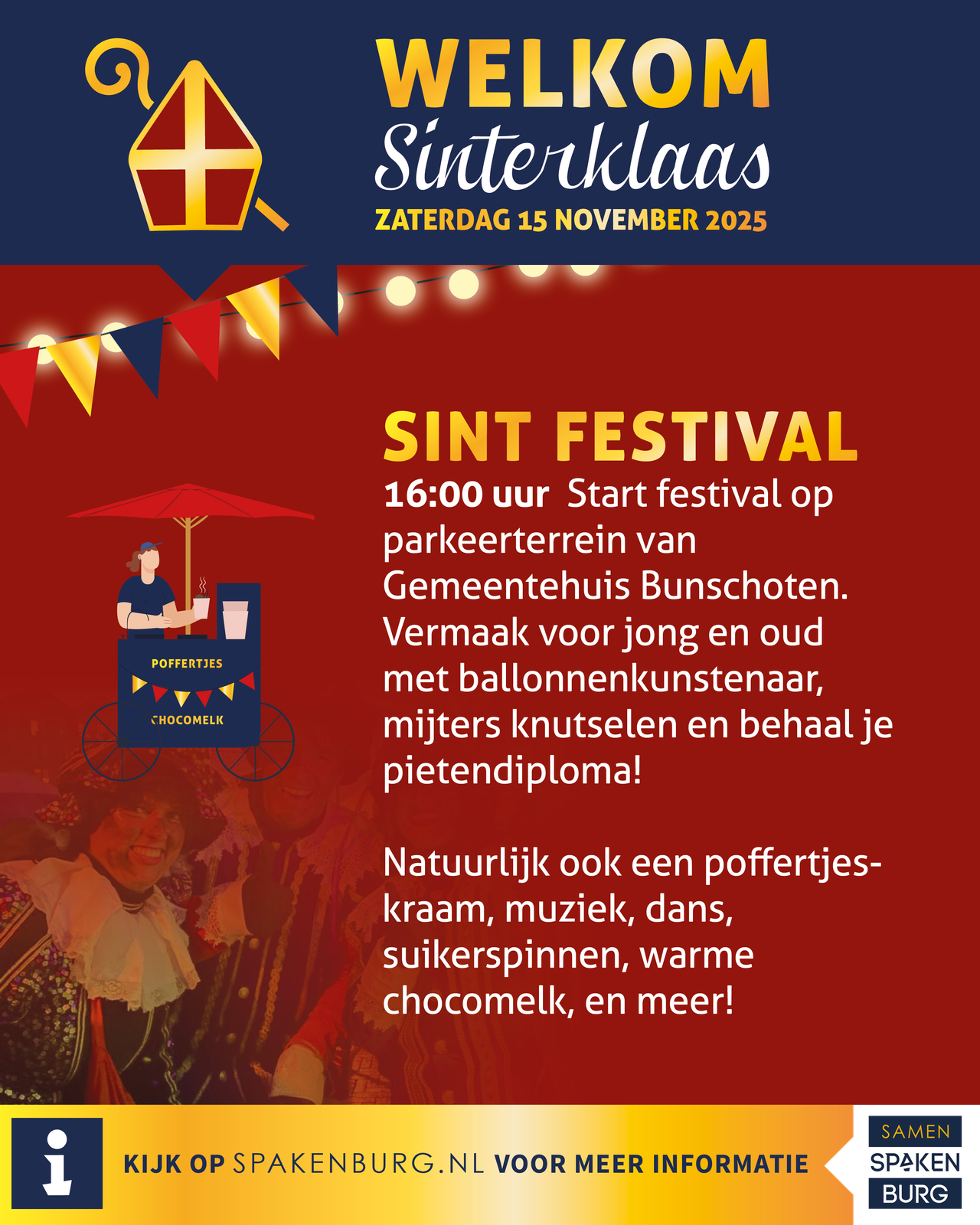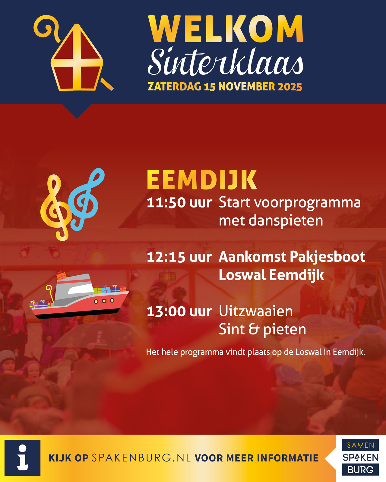Op zaterdag 15 november komt Sinterklaas samen met al zijn pieten met de boot aan op Eemdijk, zetten ze voet aan wal in Spakenburg en gaat de feestelijke optocht verder richting Bunschoten naar het festival achter het gemeentehuis!