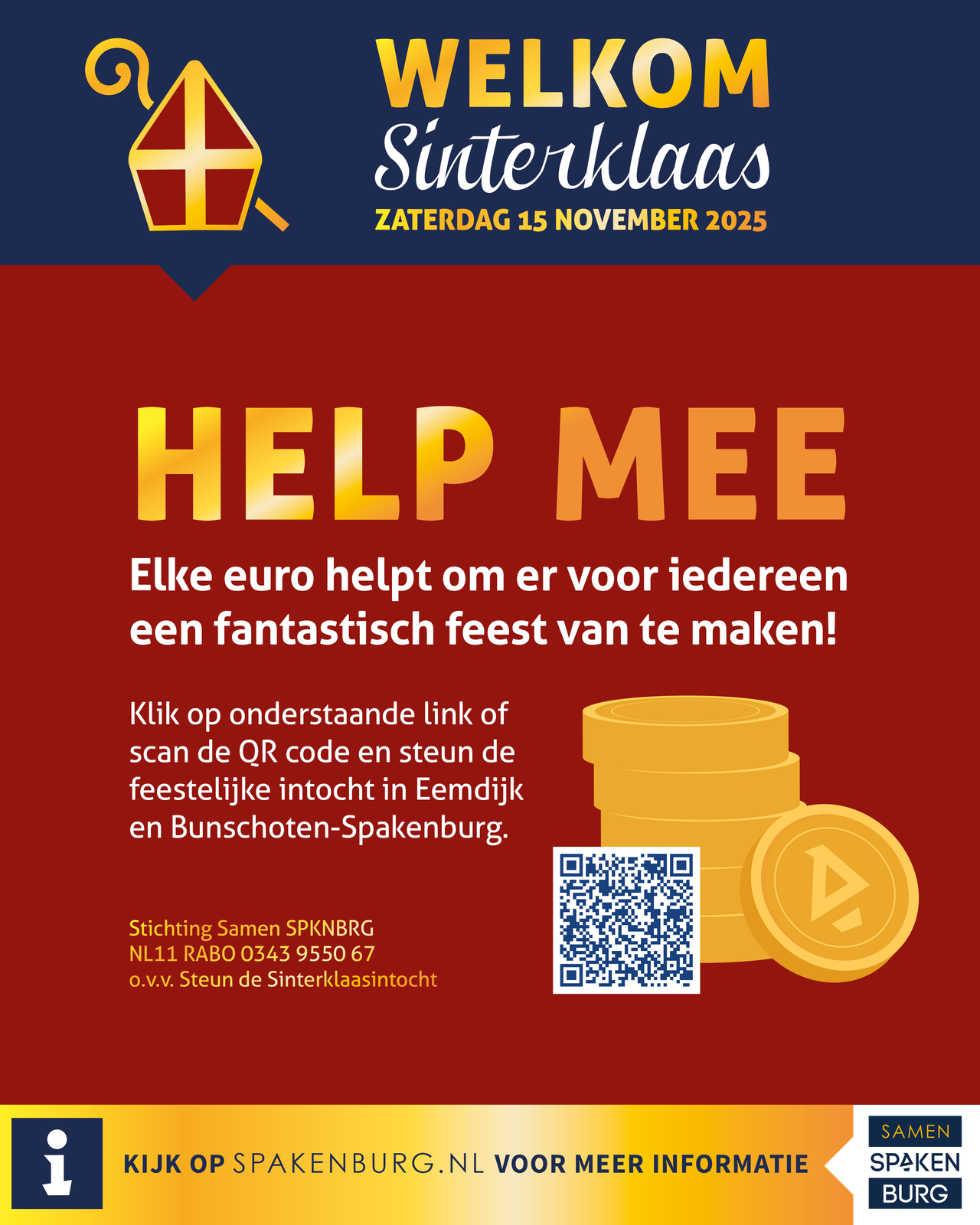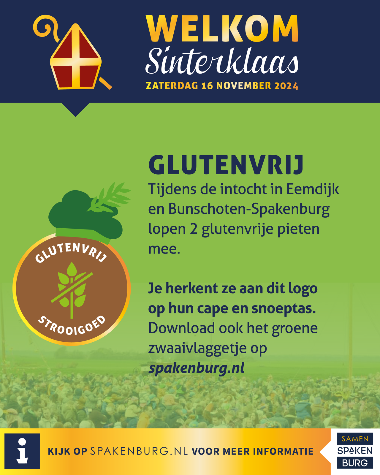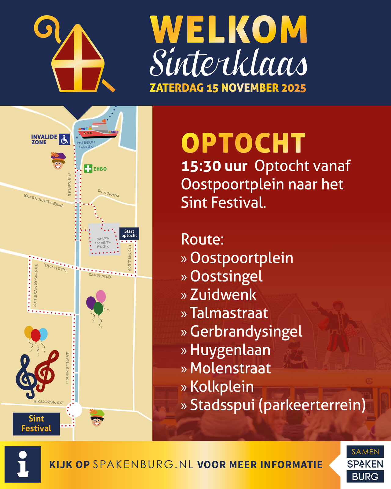 Op zaterdag 15 november komt Sinterklaas samen met al zijn pieten met de boot aan op Eemdijk, zetten ze voet aan wal in Spakenburg en gaat de feestelijke optocht verder richting Bunschoten naar het festival achter het gemeentehuis!