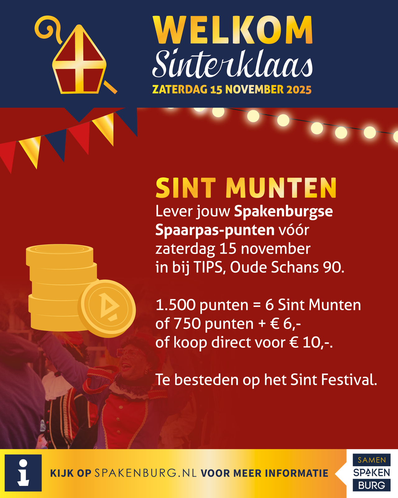 Tijdens het Sint Festival betaal je met onze eigen Sint Munten. Deze koop je vooraf met je Spakenburgse Spaarpunten bij TIPS, het Toeristisch Informatie Punt Spakenburg aan de Oude Schans 90. Tijdens het Sintfestival zijn ze ook te koop; met PIN of cash.