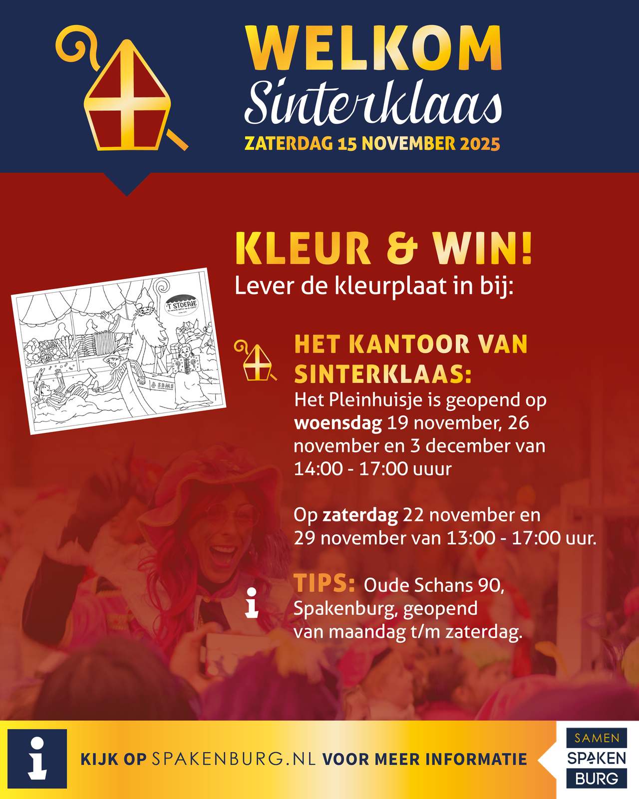 De kinderen van alle basisscholen zullen een kleurplaat ontvangen. Als dat niet zo is, haal deze kleurplaat dan op bij het Toeristisch Informatie Punt. Lever je kleurplaat weer in bij het 'kantoor van Sinterklaas'